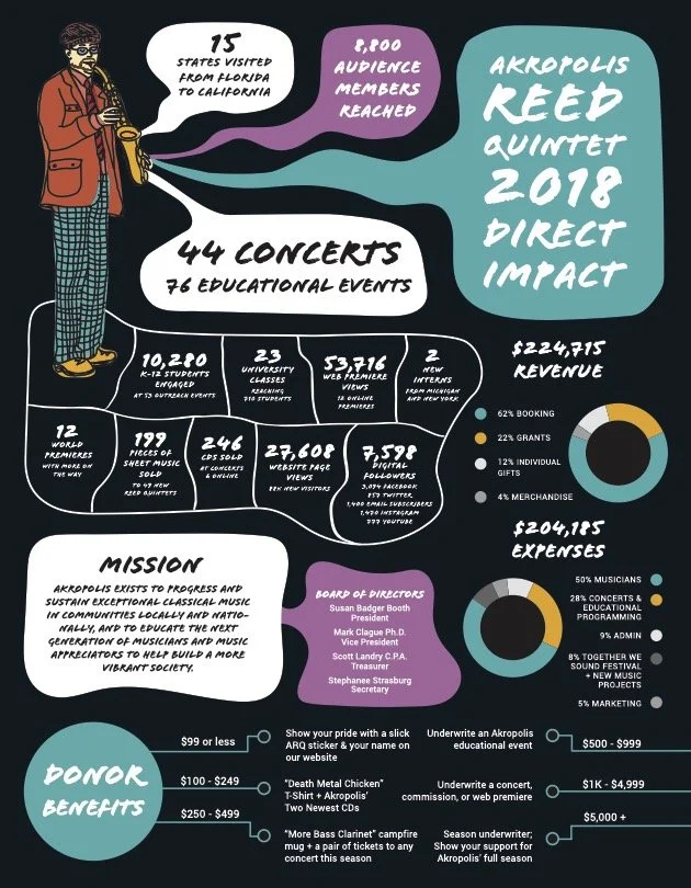 Akropolis Quintet, Inc. is a 501(c)(3) nonprofit organization created by and governing the internationally-acclaimed contemporary music ensemble, the Akropolis Reed Quintet. Our mission is to create a more vibrant society with greater accessibility to contemporary music through our quintet’s artistic excellence utilized in performances, educational workshops, and community engagement.